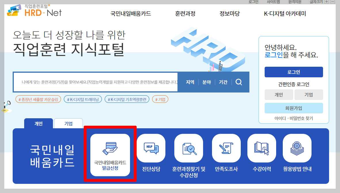 급격한 사회 기술발전에 우리 국민이 스스로 직업개발훈련을 실시 할수 있도록 나라에서 지원을 해주는 사업을 한다고 합니다 1인당 300만원에서 최대 500만원까지 훈련비를 지원해 준다고 합니다. 국민이면 누구나 신청이 가능합니다. 내일배움카드로 경력이 단절된 여성분들과 구직이 어려운 청년들 모두 새로운 직업개발로 한발 앞서 나가 봅시다!